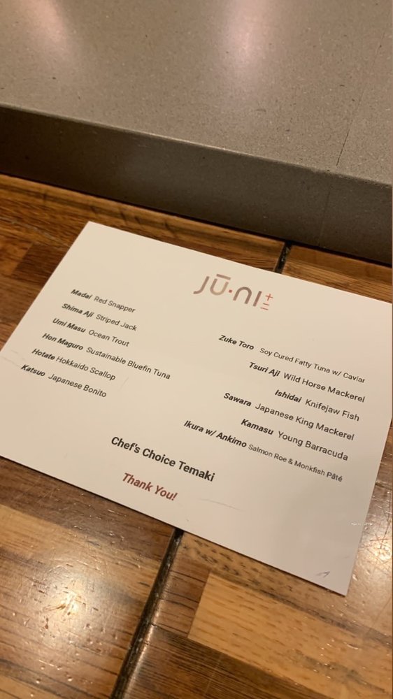 “ My husband surprised with a birthday dinner at JuNi as I love Omakase. For anyone interested in booking Ju-Ni, please know that you have to book in advance as well as prepay everything before. I believe that cancelling isn't easy either so please be mindful when deciding. After all that, you're in for an amazing Omakase experience. It is a very small cozy restaurant with a sushi chef that takes care of 4 people at time. The chef we had was extremely skilled, knowledgeable, and friendly. As I'm an avid sushi lover and Omakase connoisseur, it was a really fun experience taking each nigiri in and trying to understand and enjoy the combination of flavor for each fish. The fish was extremely fresh and buttery. Literally, everything was melting in my mouth. Their drink selection is small but I enjoyed my white wine. I didn't try their sake so cannot comment on that. An indulging dinner but a very memorable one. Definitely will come back for a big occasion! ”